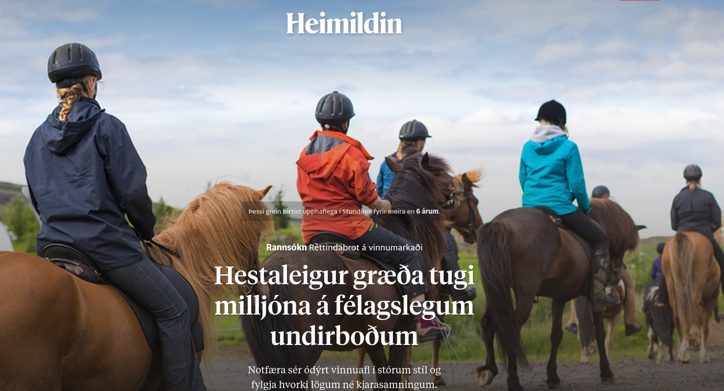 In 2018 Heimildin wrote an investigative article about several companies offering horse riding tours. They posed as a 19 year old Danish women, looking for a job guiding horse riding tours. According to the article, Sólhestar, Lýsuhóll, Geysir hestar, Hestasport, Alhestar, Kíðafell, Stóri-Kambur, Hestaleigan Galsi, Hömluholt, Leirubakki, Jóreykir, Oddsstaðir, Skálakot and Giljar wrote back, offering volunteering opportunities for food and accommodation and wages much lower than specified in the collective agreement. Below are the screenshots of some of the exchanges, as they appeared in the articles: